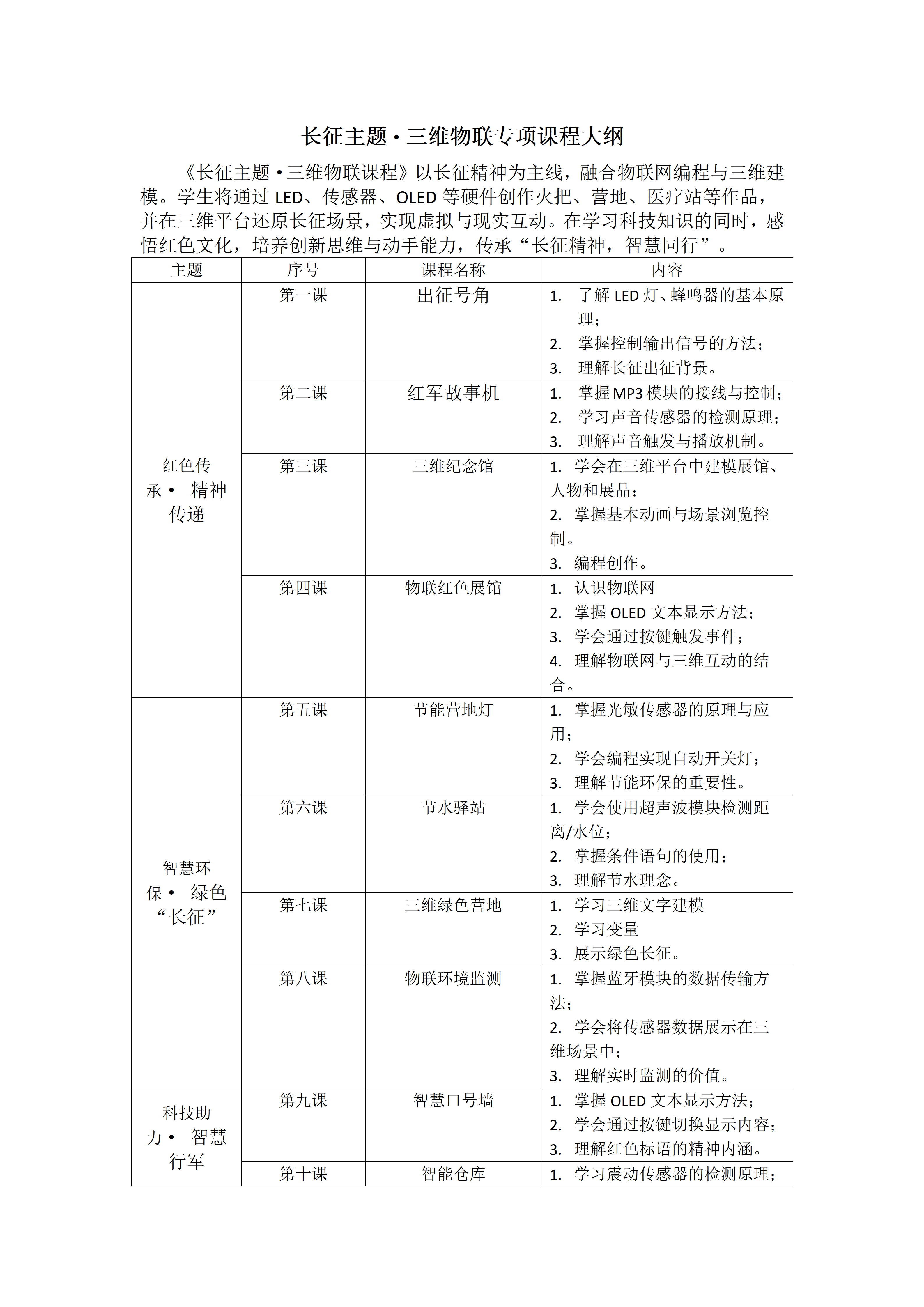 学习目标:《长征主题·三维物联课程》以长征精神为主线,融合物联网编程与三维建模。学生将通过LED、传感器、OLED等硬件创作火把、营地、医疗站等作品,并在三维平台还原长征场景,实现虚拟与现实互动。在学习科技知识的同时,感悟红色文化,培养创新思维与动手能力,传承“长征精神,智慧同行”。 |