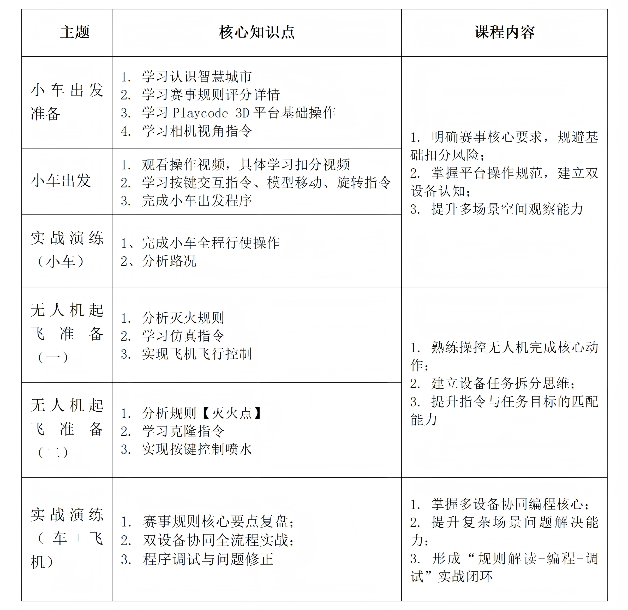 本课程围绕 “小车交通通关 + 无人机灭火”双设备协同挑战展开教学。课程采用四阶段进阶式设计,从城市交通规则、小车驾驶与避障,到无人机飞行控制、灭火判定、克隆喷水,再到最终的双设备协同调度,全面提升学生的综合编程能力。